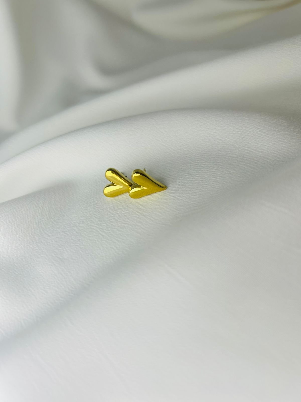 Gold minimalist heart earrings set on a sleek, textured white fabric backdrop. The features