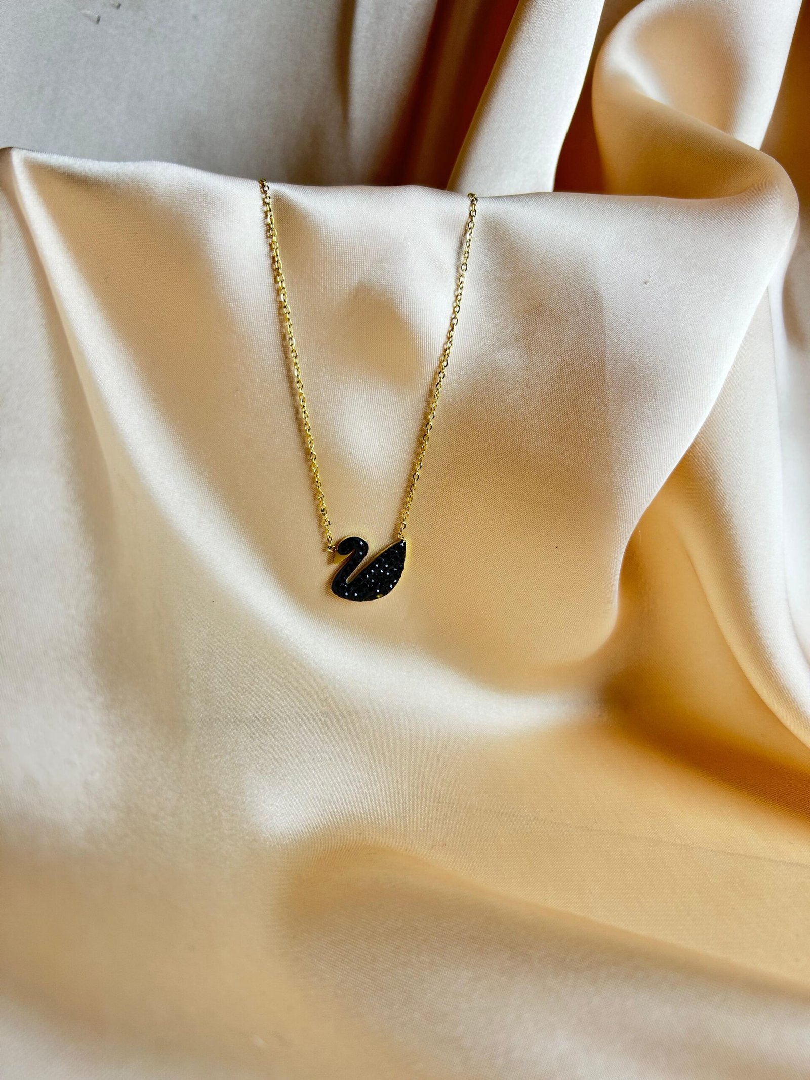 Elegant gold necklace featuring a delicate, swan design pendant with black stones. The